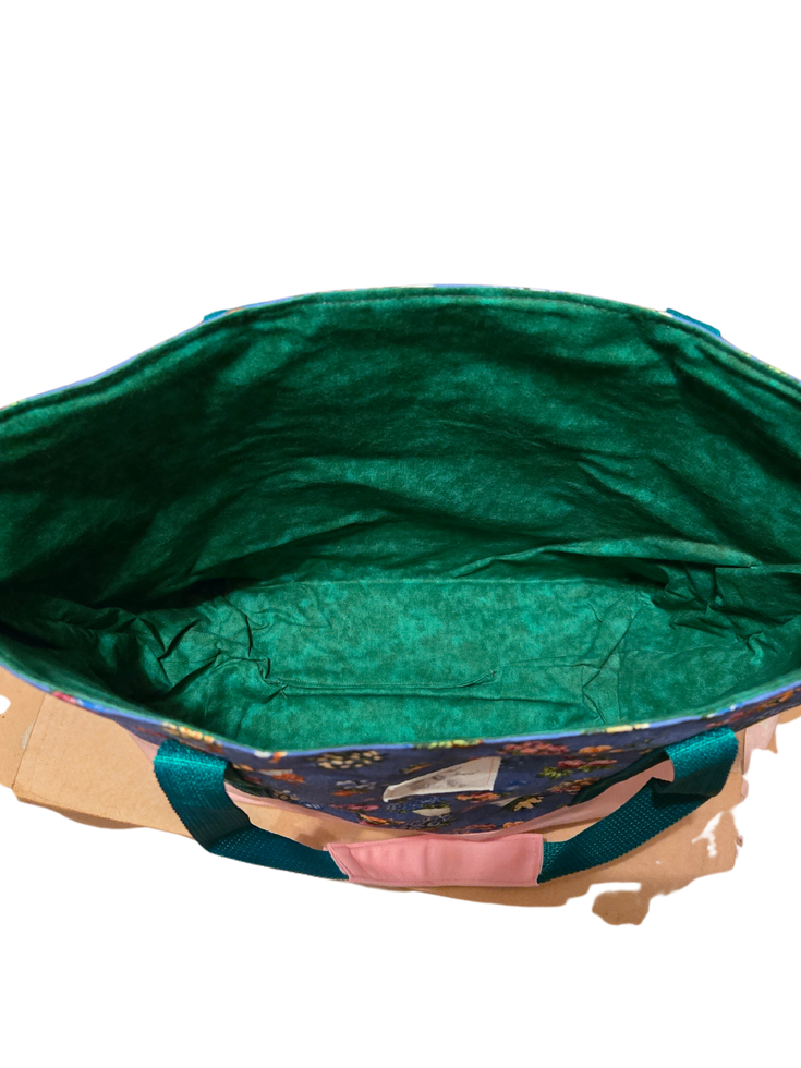 This is a simpler bag but awesome for beach trips library stops, and grocery runs. It provides so much space and can hold so much weight. The straps have a canvas grip on the double stiched strap. The outside offers a fun feel with the flower pots contrasting with the light pink canvas and dark green interior.